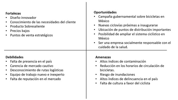 En el apartado 5 se muestra la representación gráfica de nuestro análisis FODA, sabemos que debemos enfocarnos en crear conciencia de las ventajas del uso de las bicicletas en nuestro país.