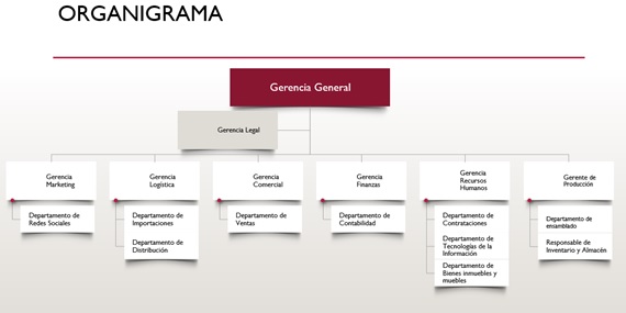 La estructura organizacional de la compañía en México atiende a la necesidad de poder cumplir con todas las actividades la compañía en las tres sedes, Ciudad de México, Guadalajara y Monterrey, siendo la primera donde ubicaremos las oficinas centrales y las bodegas de distribución a Guadalajara y Monterrey.